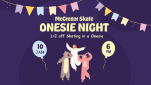 Come out to McGregor Skate for a cozy night at McGregor Skate! Put on your onesie or pajama fit and receive 50% off your skate. Admission for this event starts at 6pm.