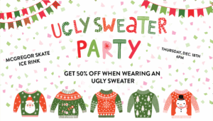 Come out to McGregor Skate for a night filled with ugly Christmas sweaters! Put on your best Christmas sweater and receive 50% off your skate. Admission for this event starts at 6pm and no ticket purchase is necessary.