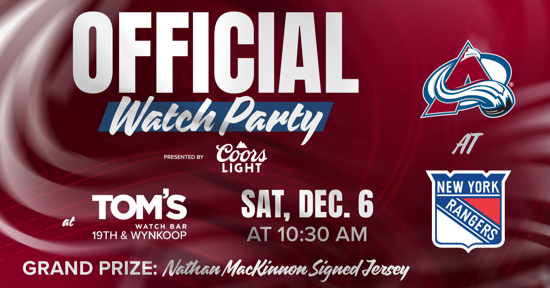 Official Avs Watch Party Saturday, December 6th at 10:30AM OFFICIAL AVS WATCH PARTY! We’re hosting the OFFICIAL Avalanche Watch Party, presented by Coors Light, as…