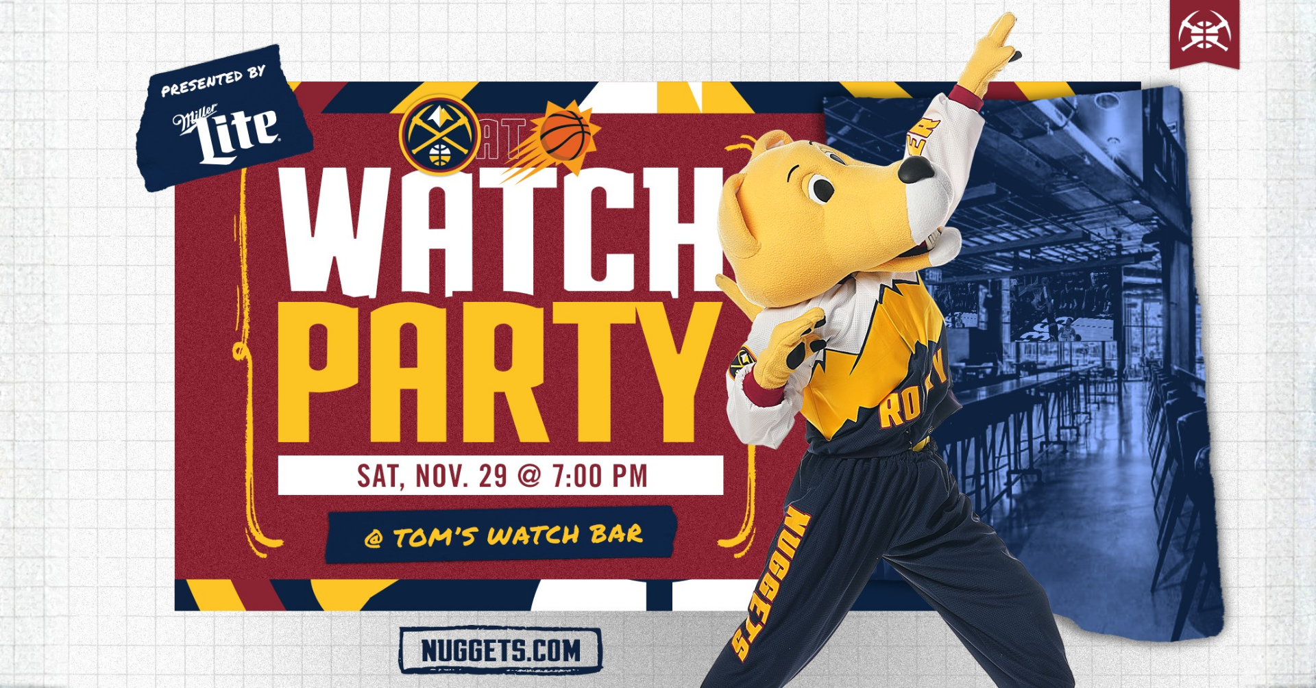 Official Nuggets Watch Party Saturday, November 29th at 7:00PM OFFICIAL NUGGETS WATCH PARTY! Join us at Tom’s Watch Bar as the Nuggets face the Suns… |
