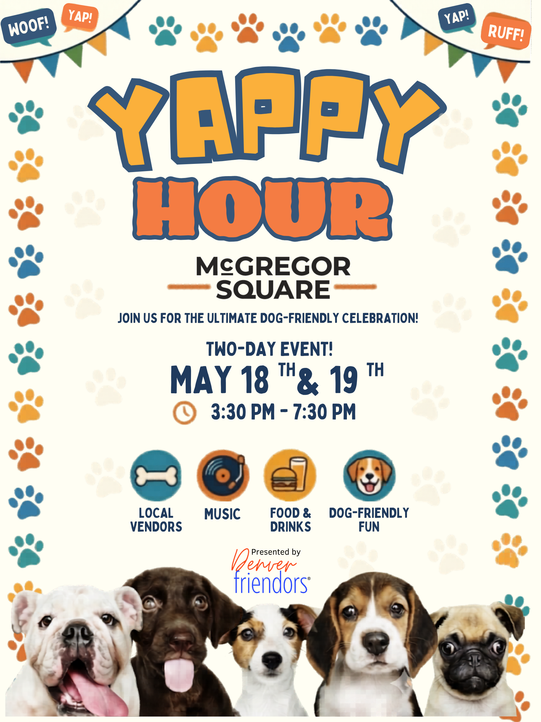 Kick off Bark at the Park with Yappy Hour at McGregor Square—a two-day, dog-friendly event with local vendors, music, and food and drinks for you and your pup. |